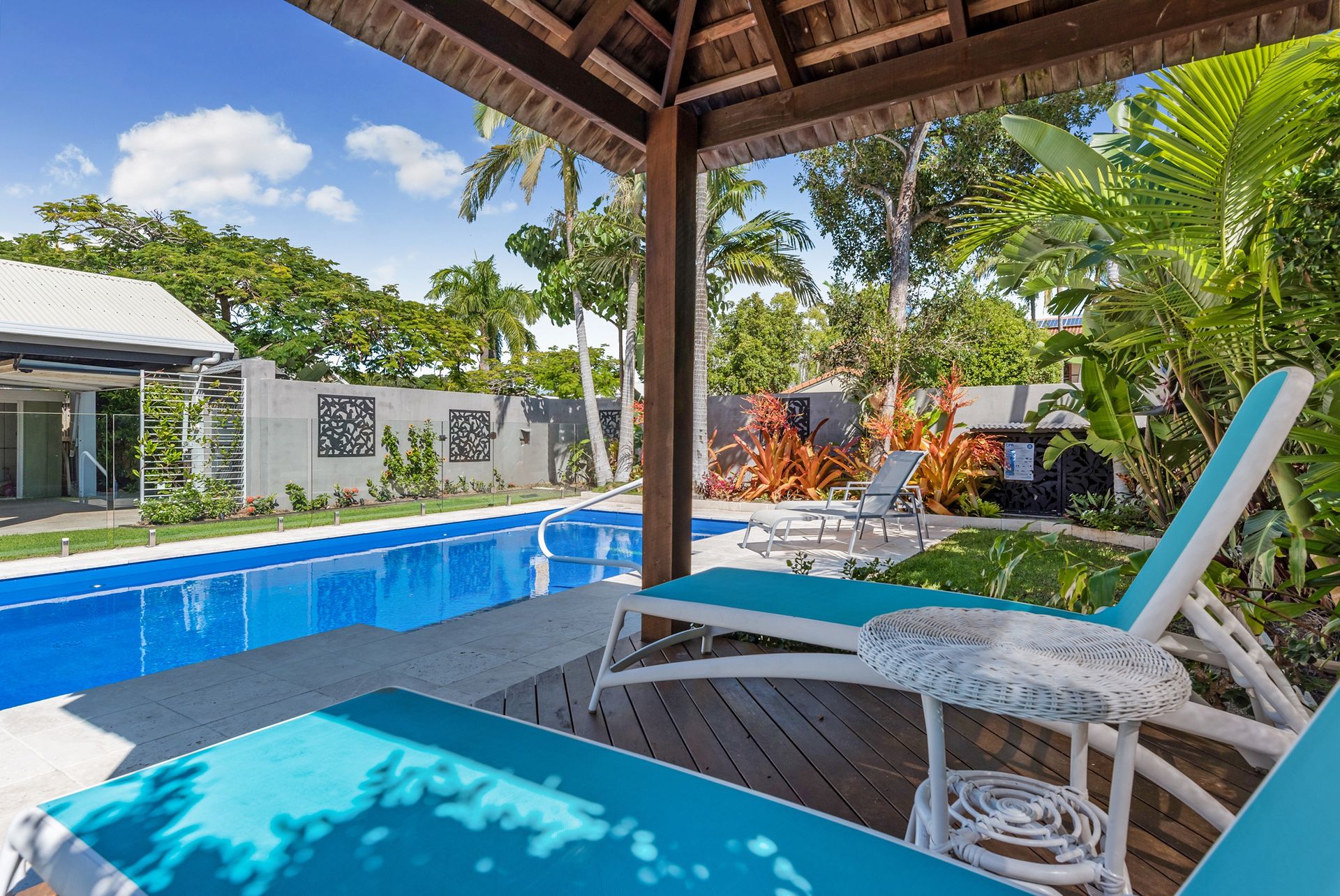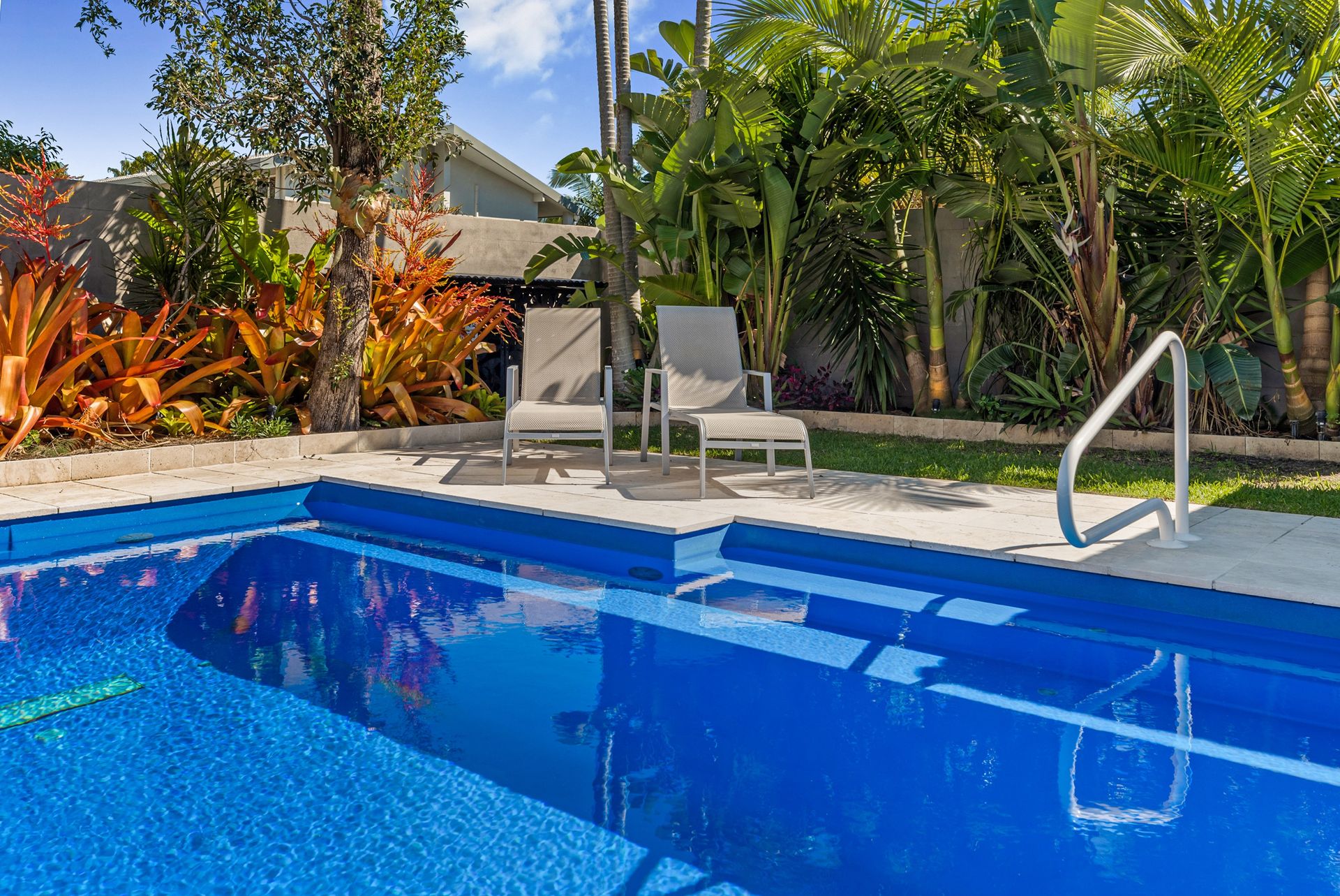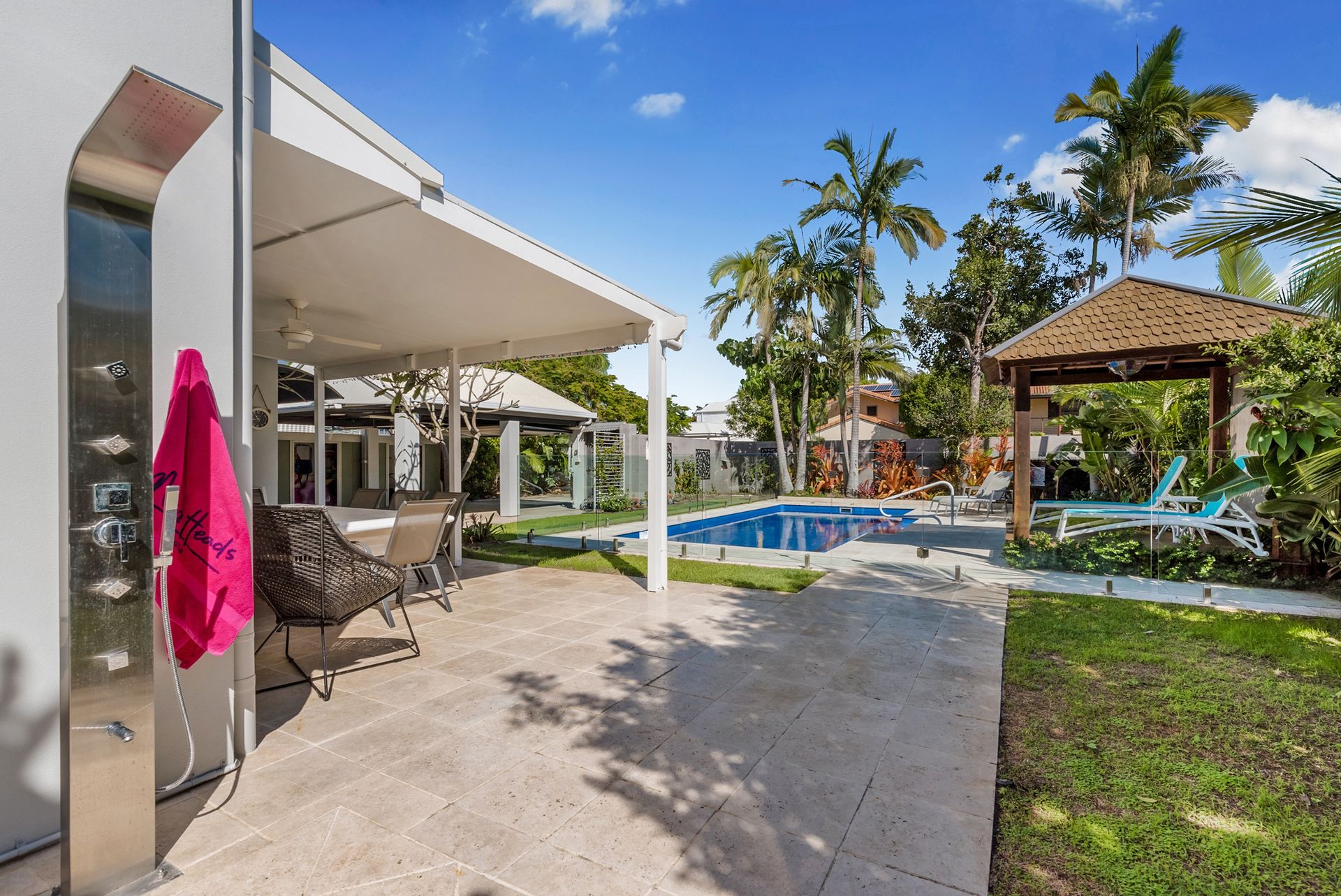 The Property: Entering the via security gate, you will be greeted with the first sign of paradise; an established garden with frangipani’s blossoming, a Bali influenced hut with sun lounges, beautifully finished, inground pool with solar heating & pool temp is set to 24-27 degrees celcius. The light outdoor tiles lead you to the front alfresco dining and entertaining area with TV and outdoor shower.