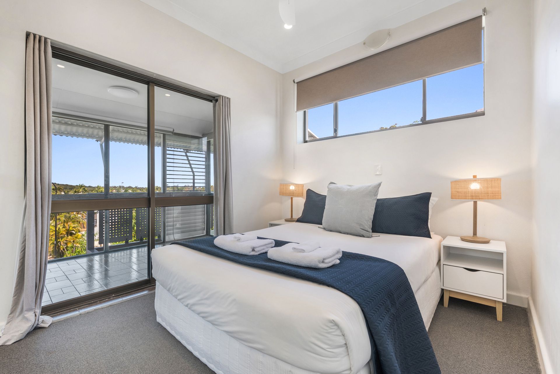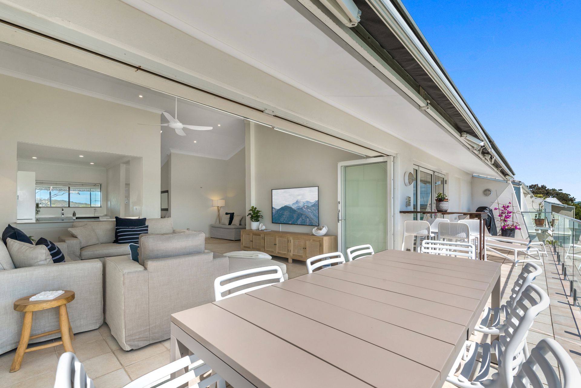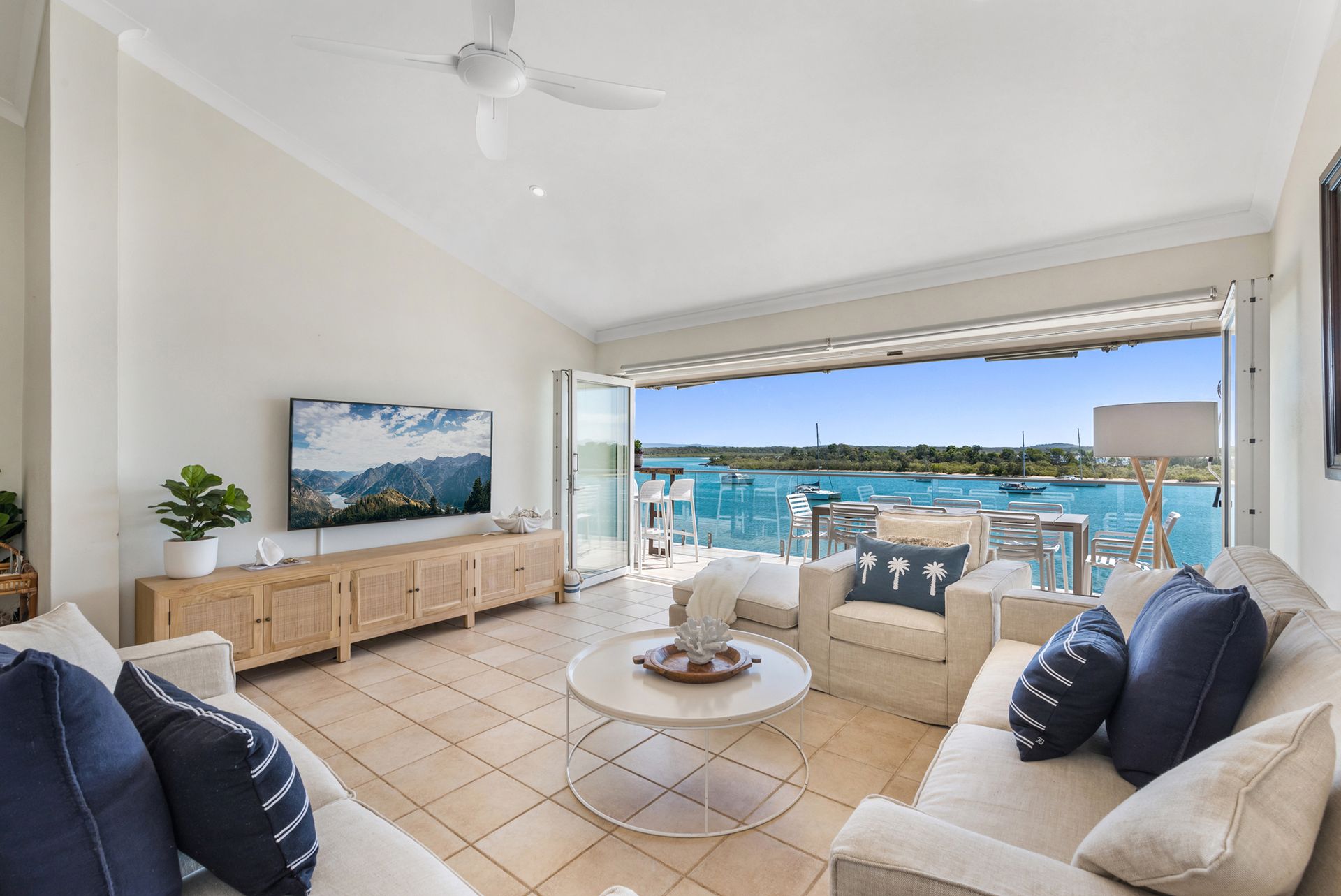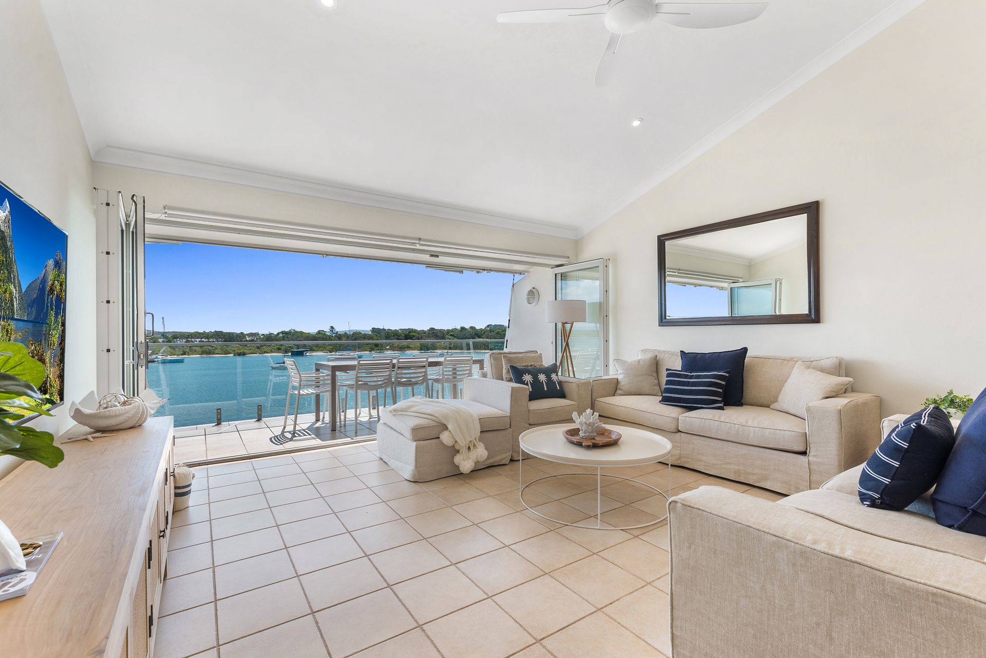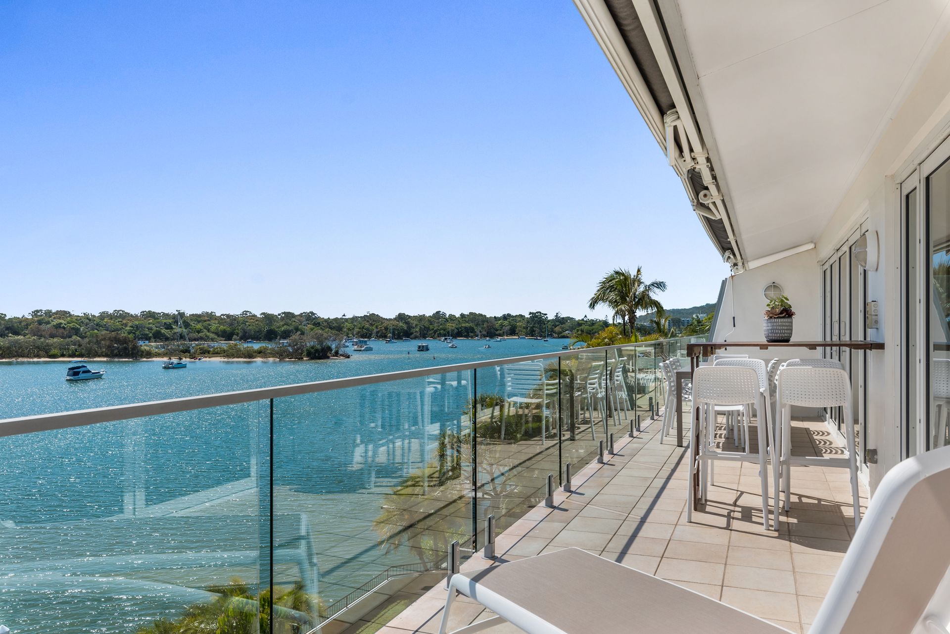 The main living area opens up completely to the balcony via folding doors. Glass lines the balcony too, so you have completely uninterrupted views over the waterside. On your private balcony, cook up a BBQ and dine at the 8-seater table, enjoy a beverage sitting on the stools at the bar table, or soak up the sun as you lay back on the sun lounges and simply - relax. There are also handy retractable awnings for when you'd prefer some shade, or you can fold it completely back so you can enjoy the blue sky above as well as the sparkling waters below.