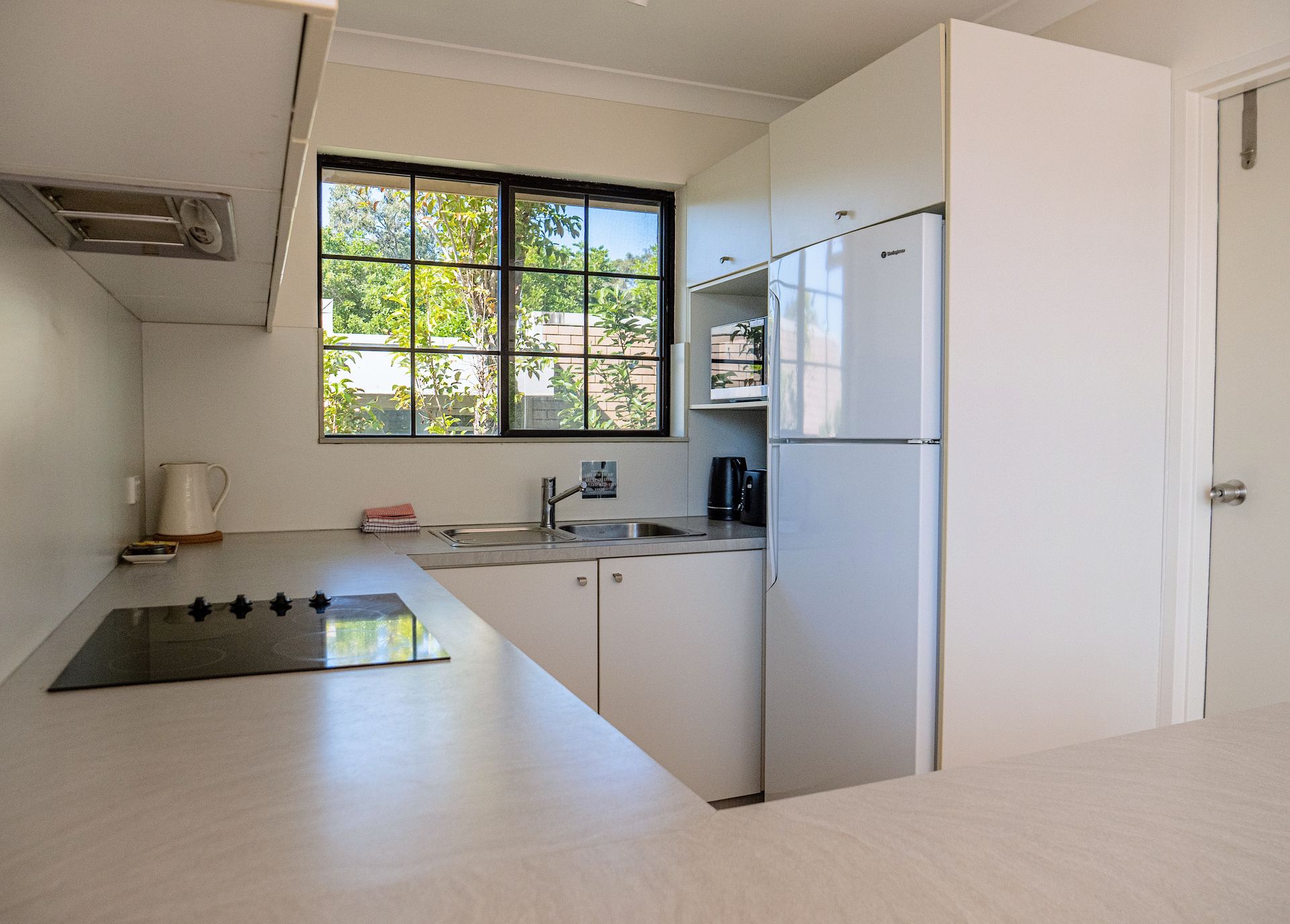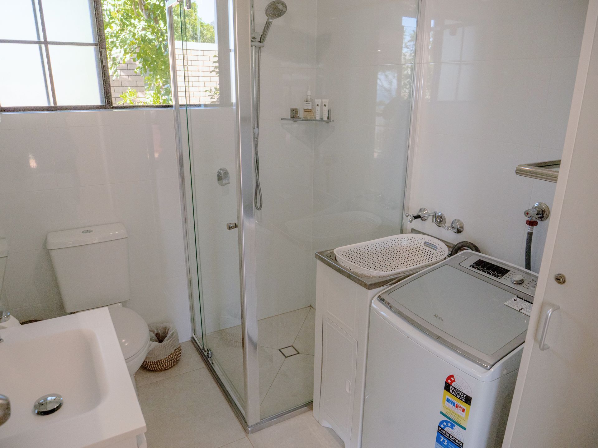 Features a self-contained kitchen which includes microwave, dishwasher, fridge, oven and cooktop. Also has a washing machine without dryer.
