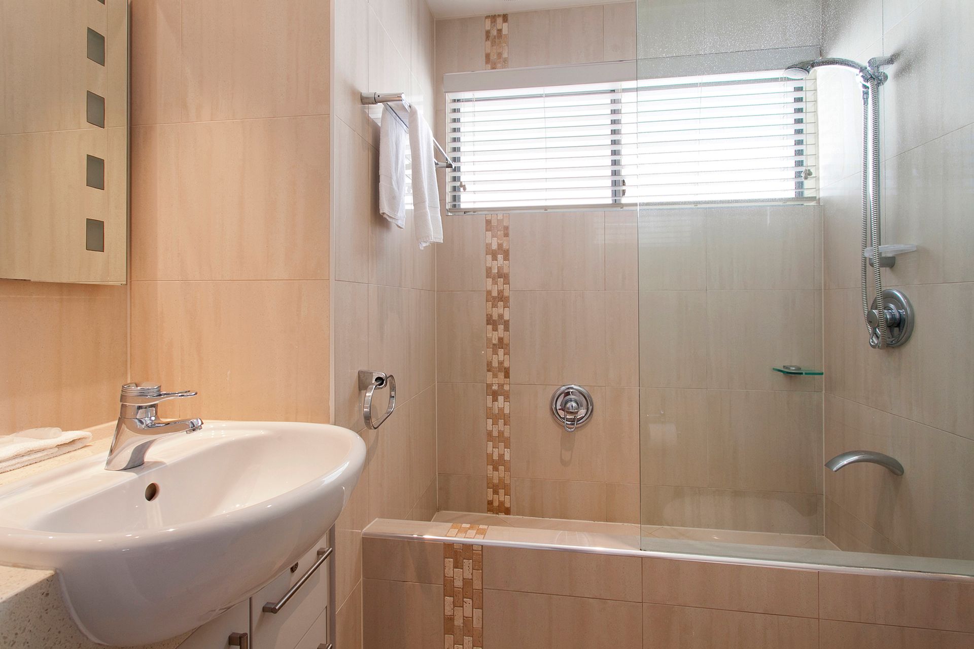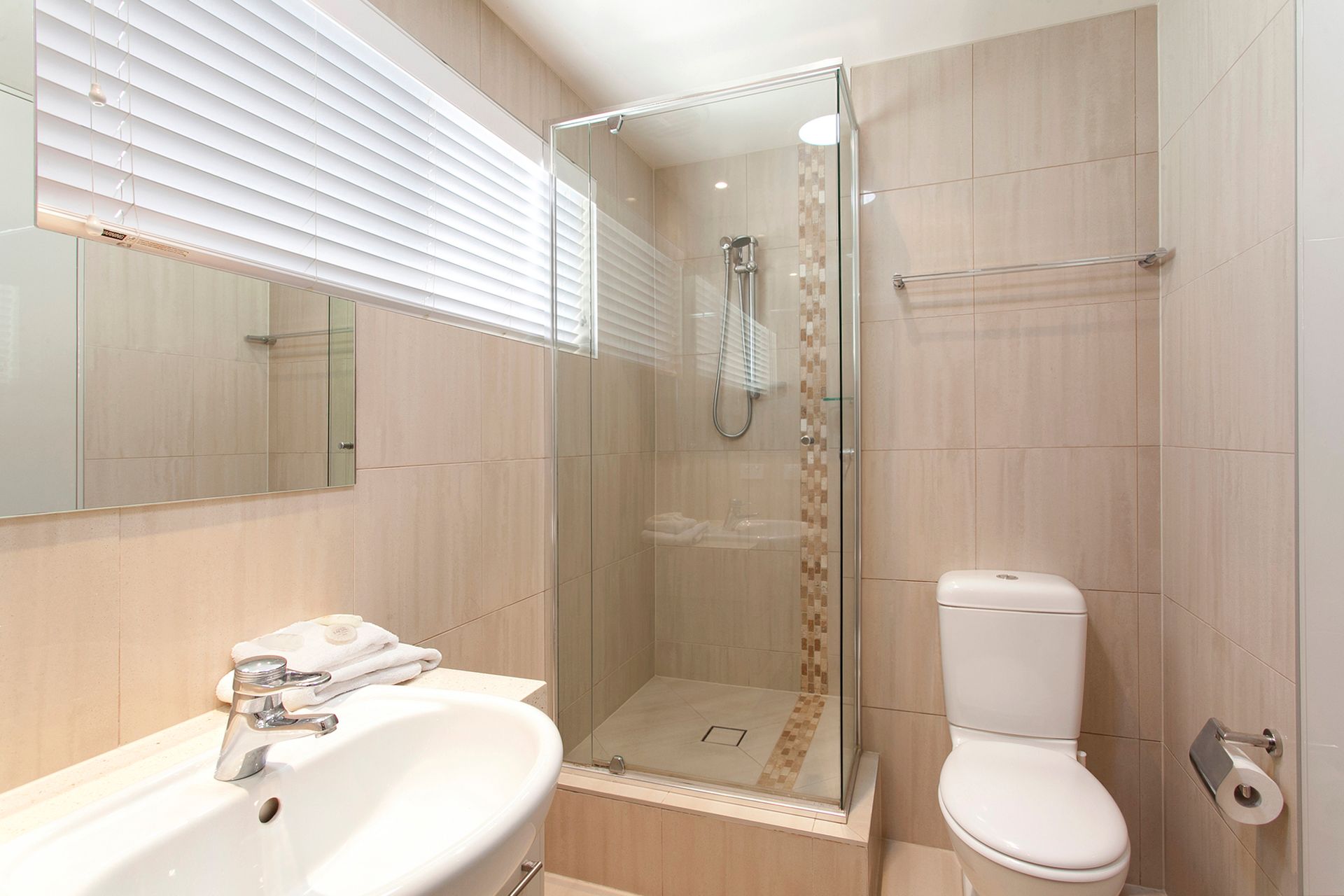 The main bedroom overlooks the river with a queen bed, bedside tables, and a ceiling fan and ensuite. The second bedroom has a king size bed and a king single bed with flat screen 55” TV with a private bathroom in the hallway with a tub, shower and toilet.