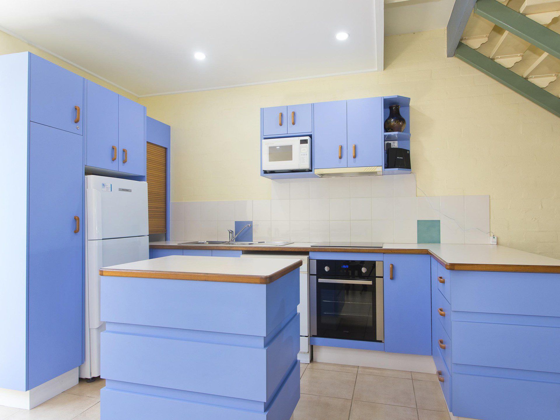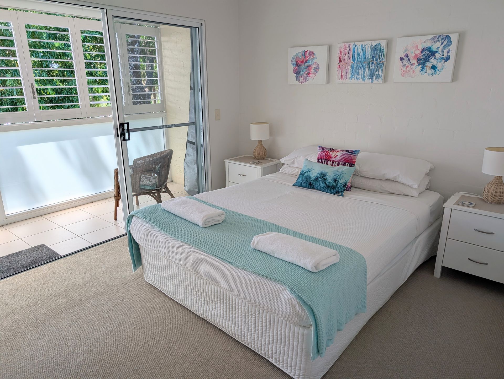 This is a 2-bedroom apartment, offering an open plan living and dining area downstairs with TV, DvD player, free internet access, air conditioning and ceiling fans throughout the area. There’s a spacious courtyard that has table, chairs, umbrella and George Foreman Electric indoor or outdoor grill where you can enjoy your alfresco dining. Balconies are fully screened and feature plantation shutters. Whilst the full kitchen includes a dishwasher, microwave, electric cook top, an under bench oven, fridge/freezer and microwave.