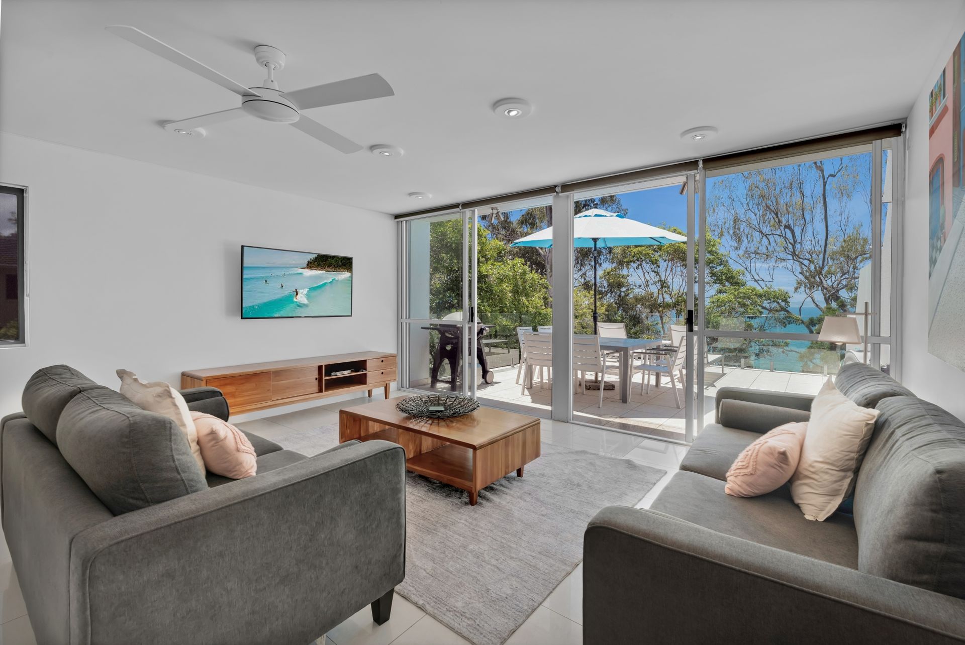 The Location- Wake up to hear the waves rolling in at Little Cove Beach, open the fashionable blinds and take in the ocean view through the lush surrounds of Little Cove. Just across the road is Little Cove Beach just perfect for a swim or even a surf out on the points. Make the most of being in such close proximity to Hastings Street with its fabulous restaurants and cosmopolitan shops. Does this sound like your idea of a perfect Noosa holiday apartment? Then Unit 5 Kareka is for you!