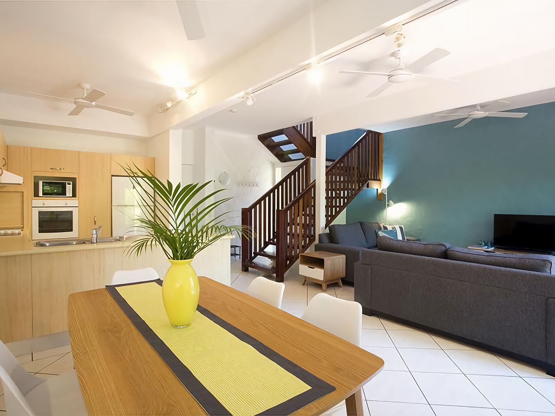The Unit – This two-level unit complex of 12 townhouses offers an open plan living and dining area with flat screen TV, free internet access, ceiling fan, and air conditioning with. The dining area is adjacent to a fully equipped renovated kitchen with quality finishes which includes Westinghouse fridge/freezer, microwave, Westinghouse wall oven, cooktop, and Omega dishwasher which provides guests with an option to prepare meals from this home away from home or to dine out at one of the restaurants nearby.