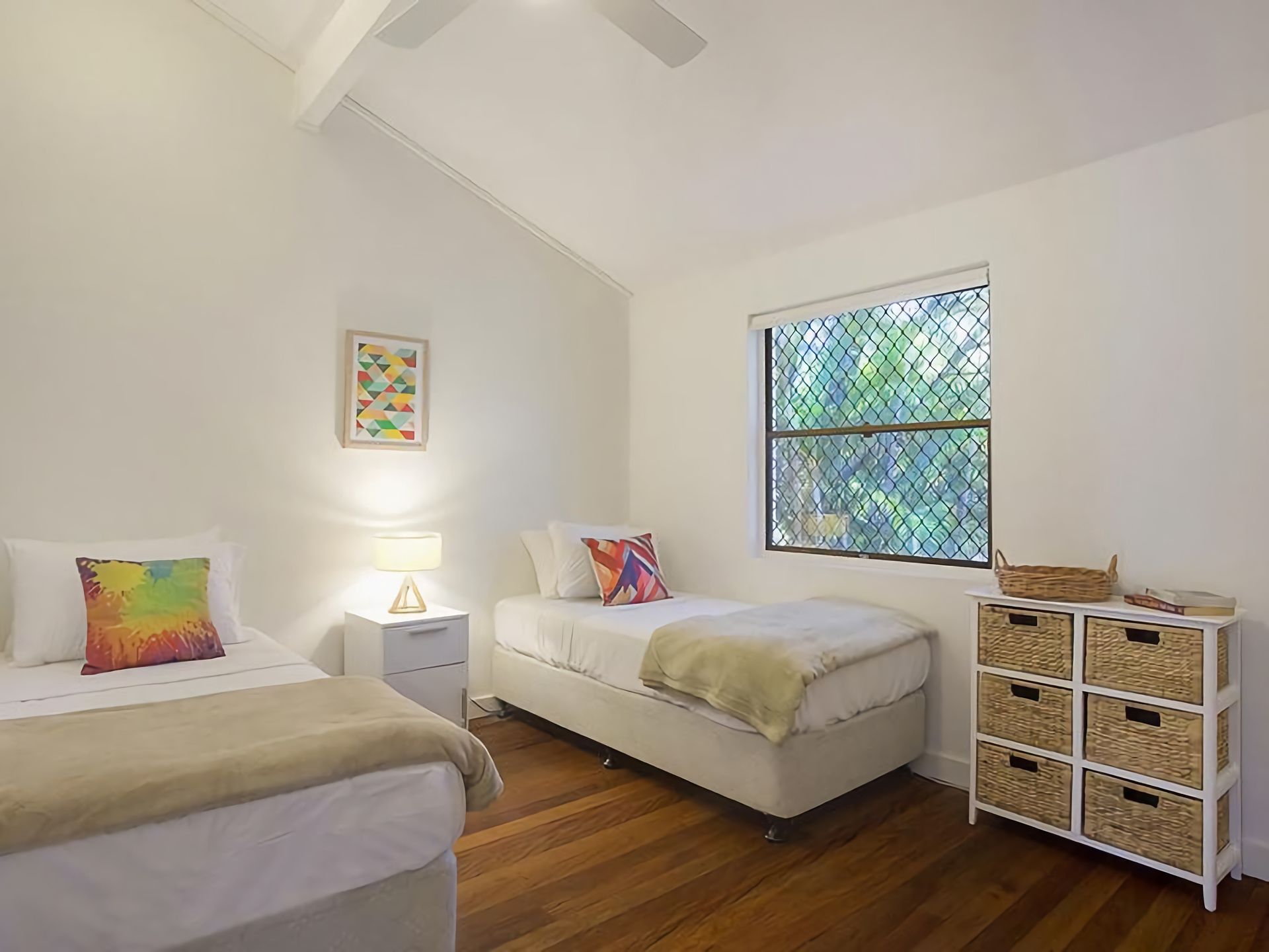 All airconditioned bedrooms are located upstairs. The main bedroom has queen size bed, with private ensuite, built-in robes and ceiling fan with an access to the balcony, while the second& third bedrooms have two single beds. The family bathroom has large walk-in shower and a toilet. The laundry facility provides Electrolux front loading washer and F&P clothes dryer.