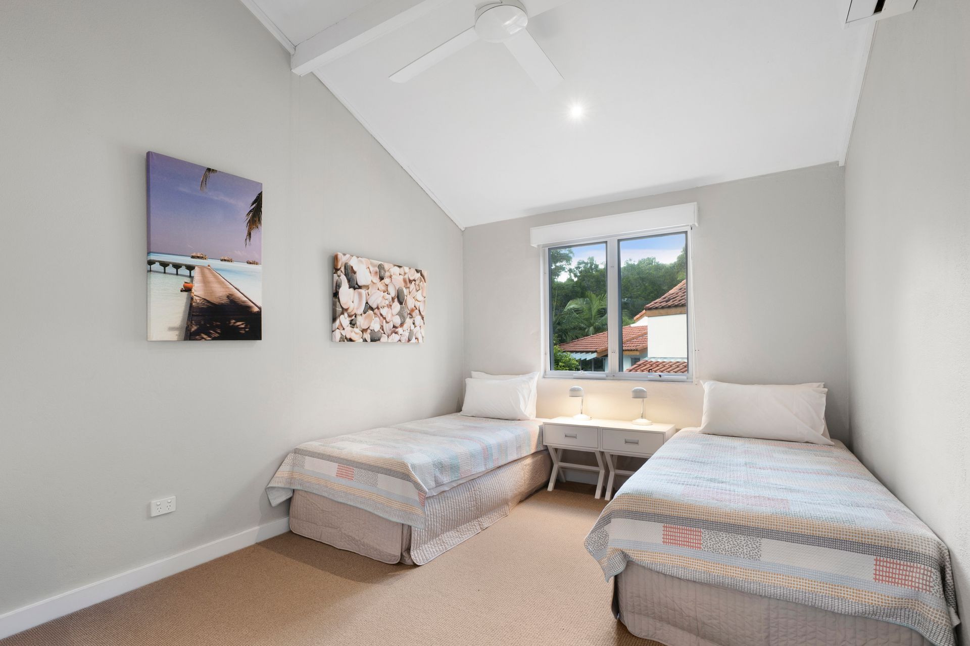 Upstairs, the air-conditioned master bedroom includes a queen bed, walk-in wardrobe, TV, and a private balcony. The second bedroom is also air-conditioned and features two single beds, making it ideal for families or friends.