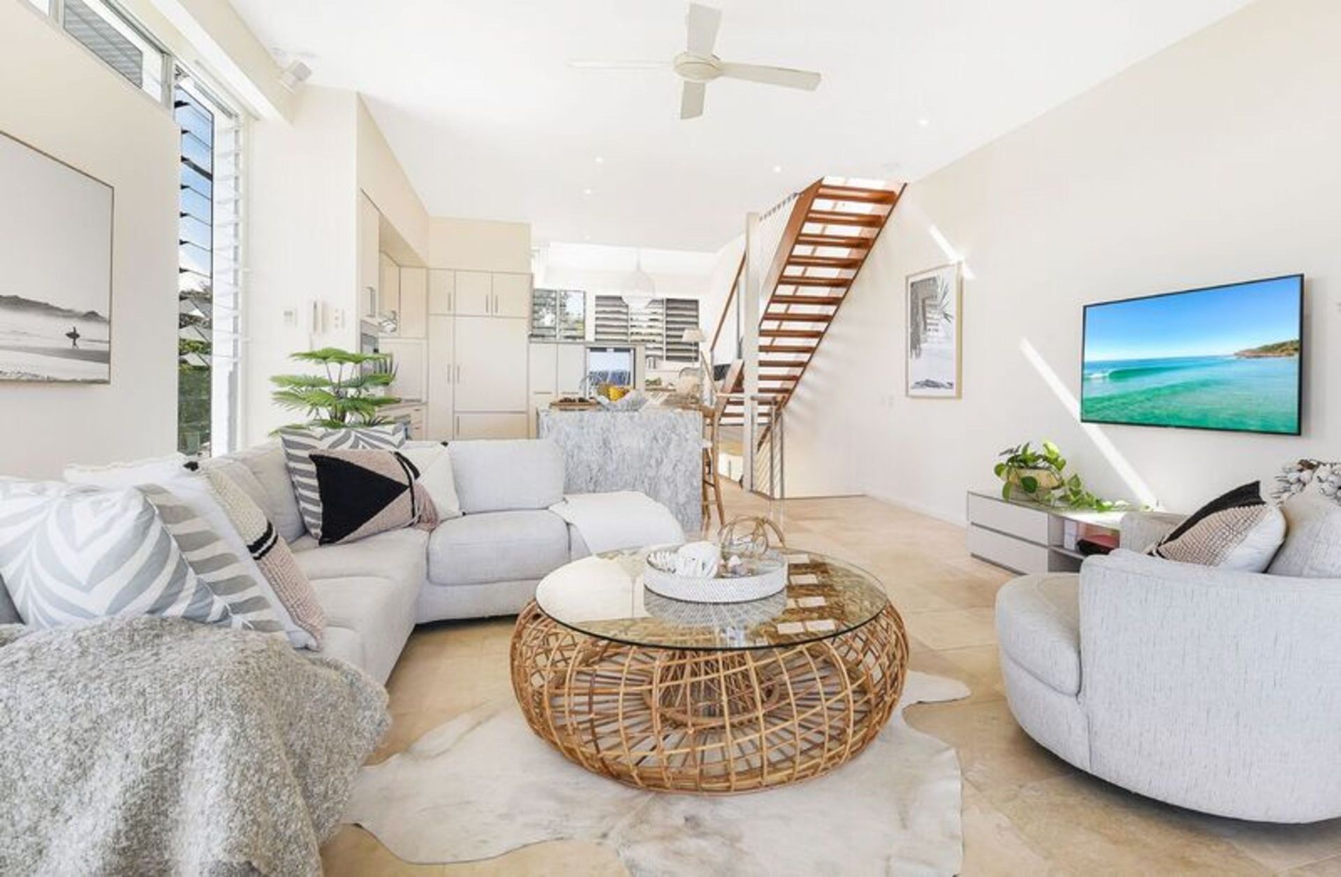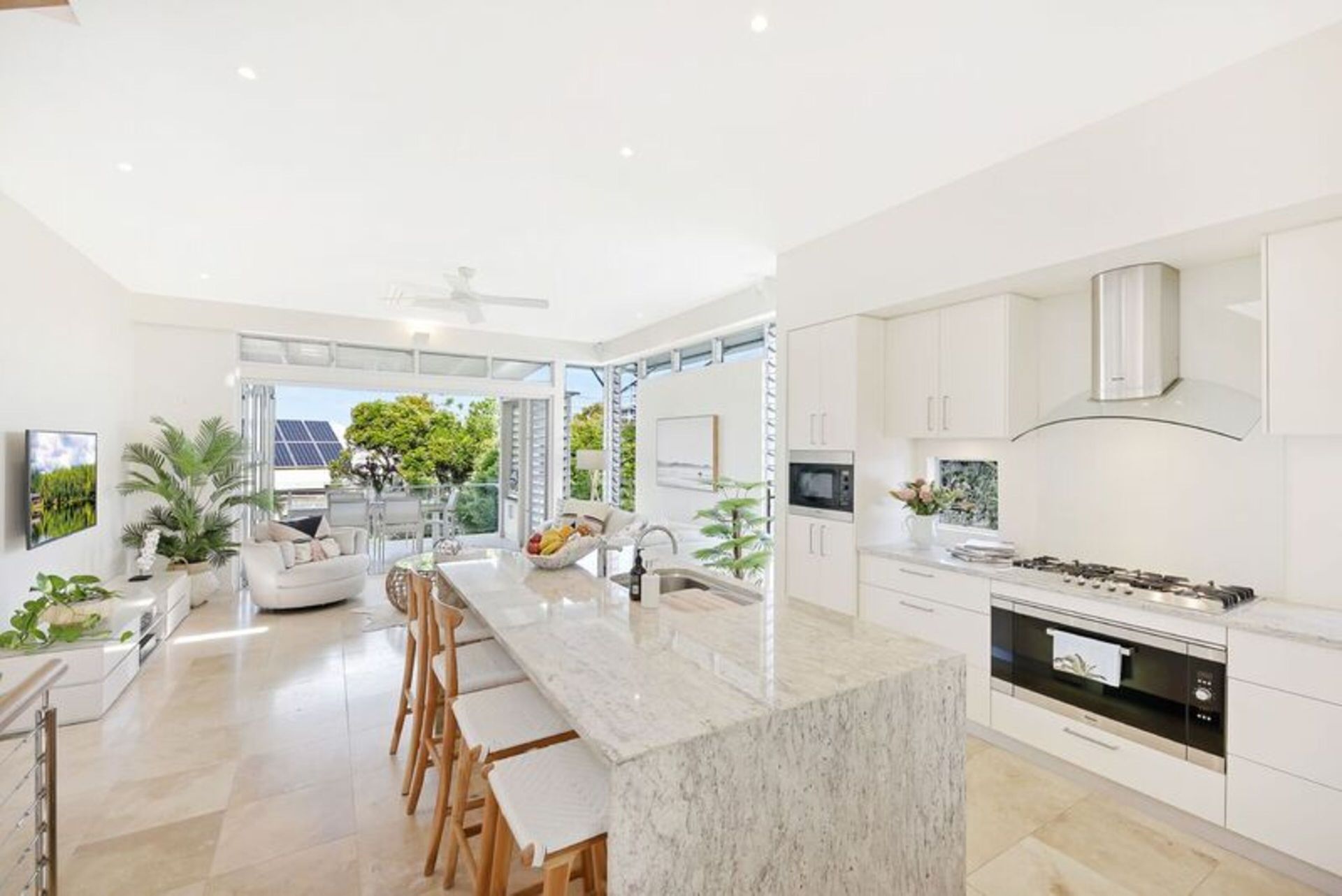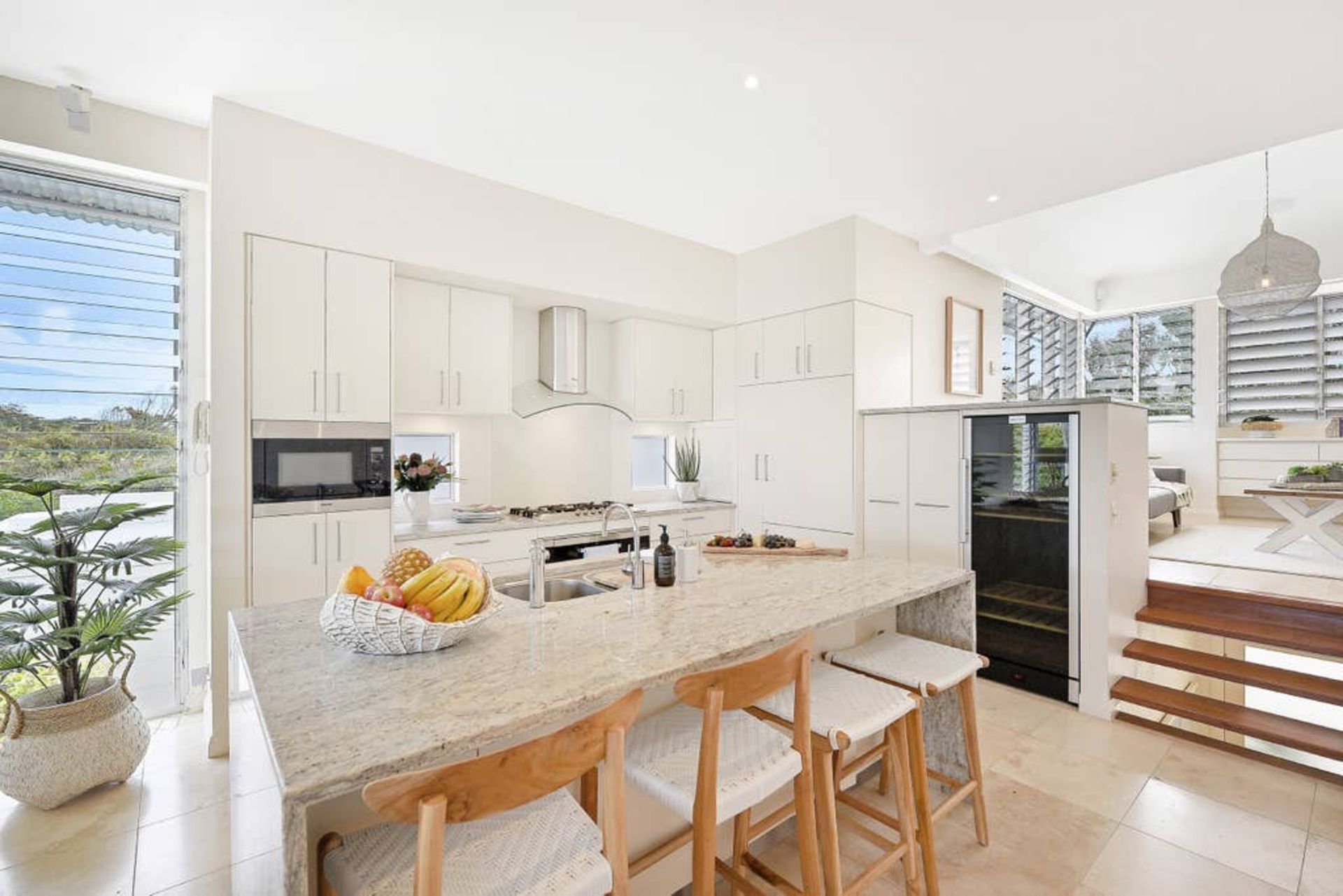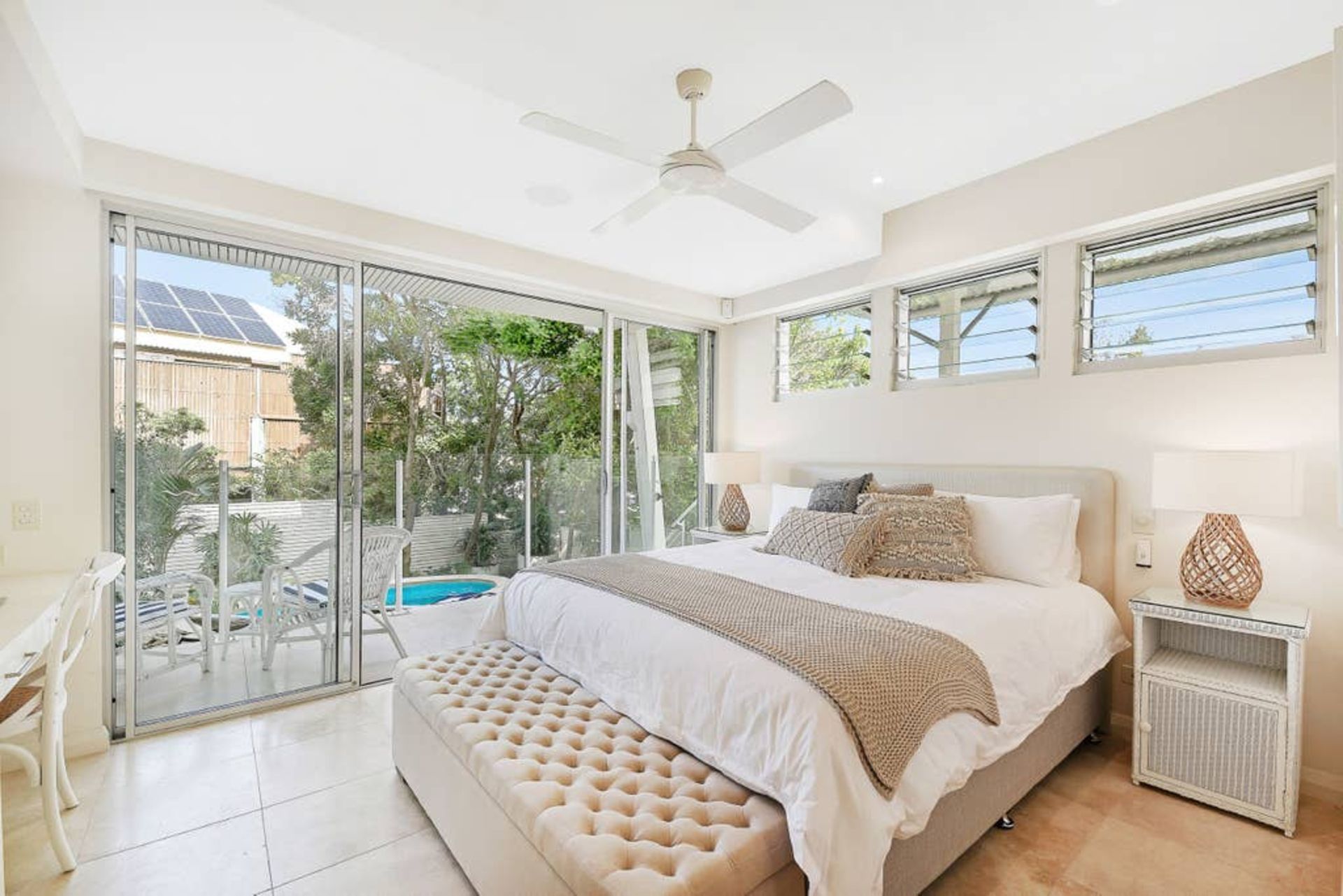 The large apartment is built over three split levels, open plan, modern and full of natural light. This recently renovated home flows over spacious levels. The lower level of the home comprises of the master bedroom with King size bed, study nook, ensuite bathroom, large built-in wardrobes, private balcony and deck overlooking the private plunge pool area. The second guest bedroom and main bathroom (also accessed from the second bedroom) are also on this level and has a Queen sized bed, 2 single bunk beds and built-in wardrobe. Crisp white hotel grade linen and fluffy white towels are provided as well as hairdryer and locally produced, pure plant-based Lief hand and body wash. Fully ducted air conditioning and ceiling fans.