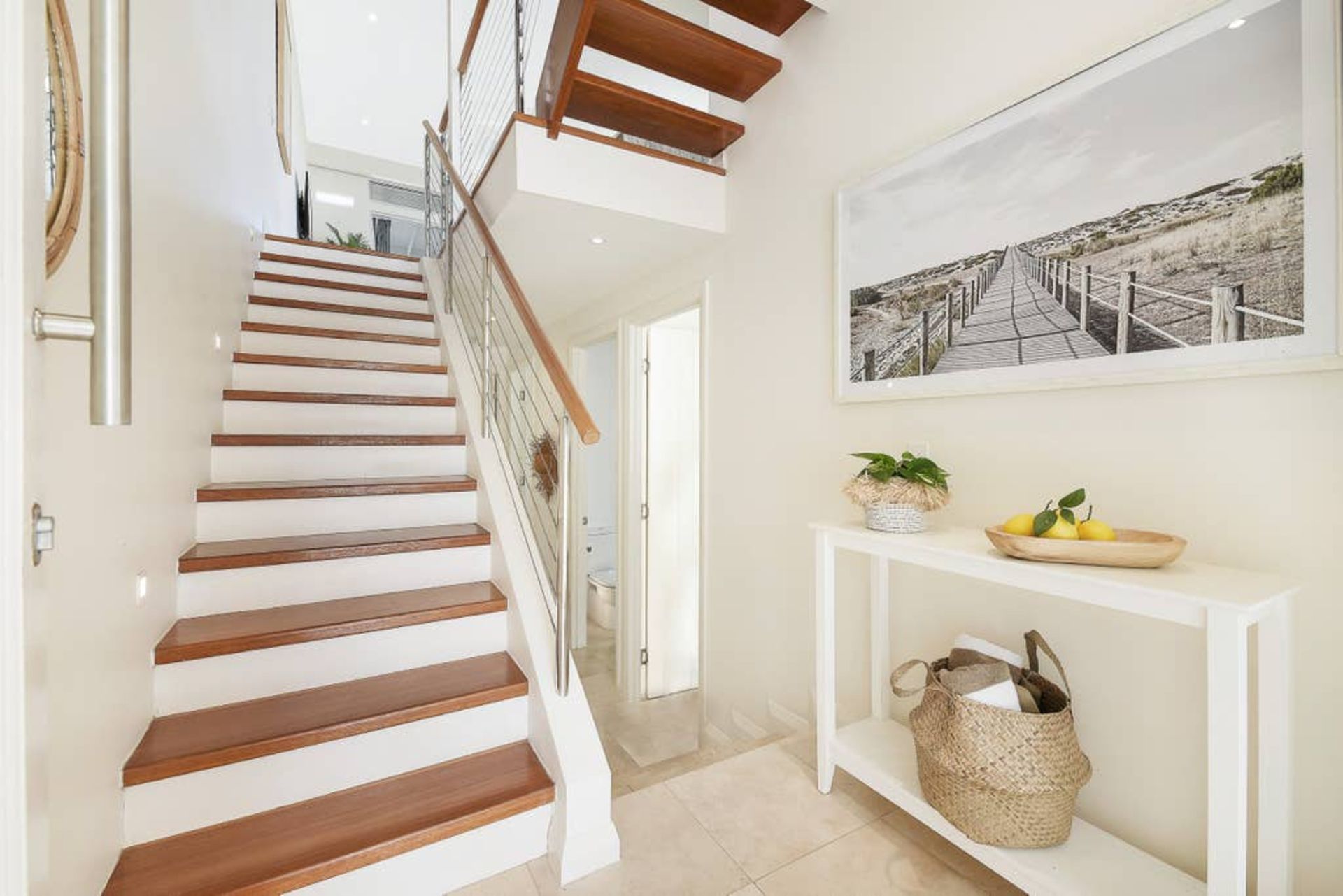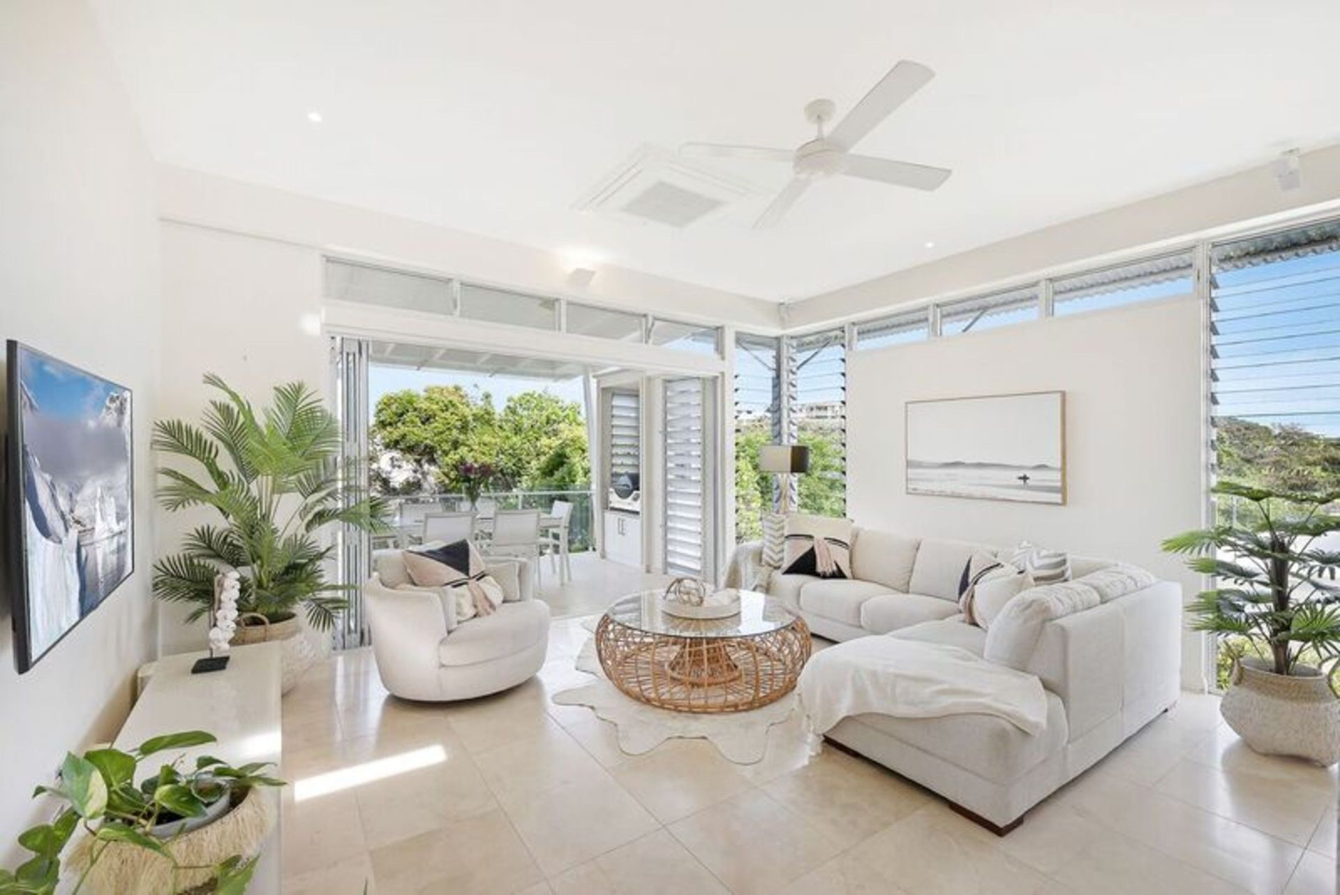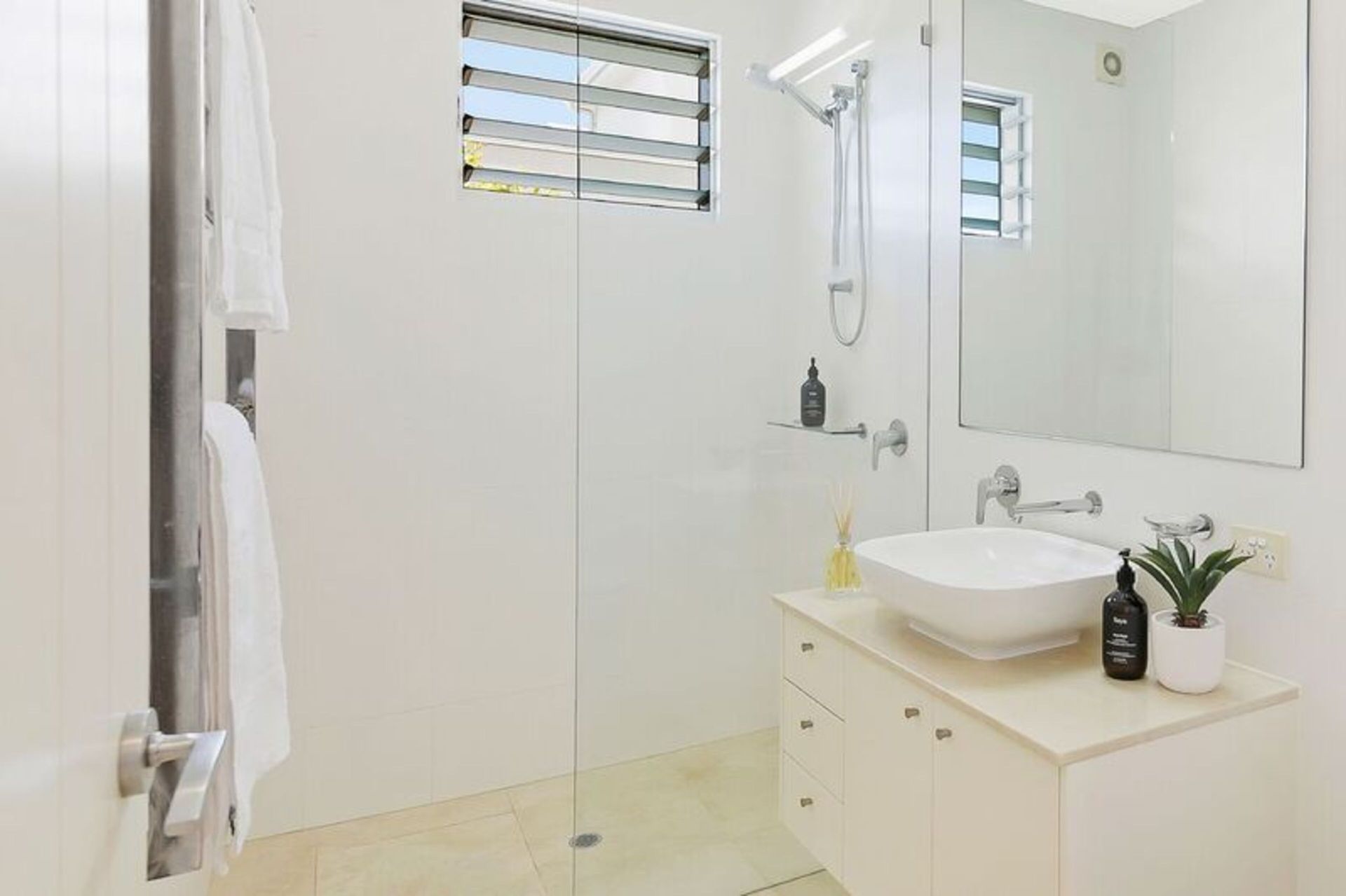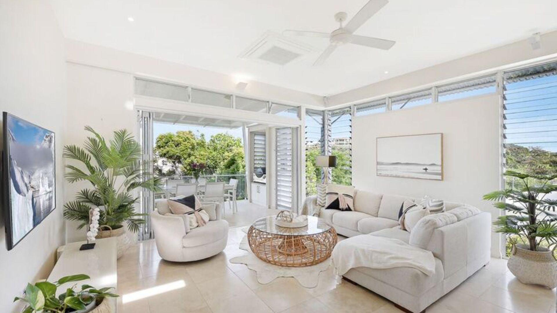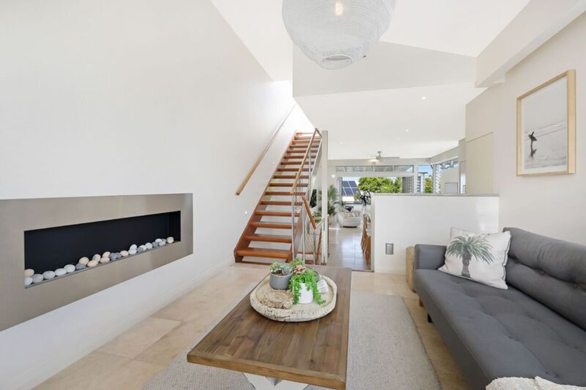 The large apartment is built over three split levels, open plan, modern and full of natural light. This recently renovated home flows over spacious levels. The lower level of the home comprises of the master bedroom with King size bed, study nook, ensuite bathroom, large built-in wardrobes, private balcony and deck overlooking the private plunge pool area. The second guest bedroom and main bathroom (also accessed from the second bedroom) are also on this level and has a Queen sized bed, 2 single bunk beds and built-in wardrobe. Crisp white hotel grade linen and fluffy white towels are provided as well as hairdryer and locally produced, pure plant-based Lief hand and body wash. Fully ducted air conditioning and ceiling fans.