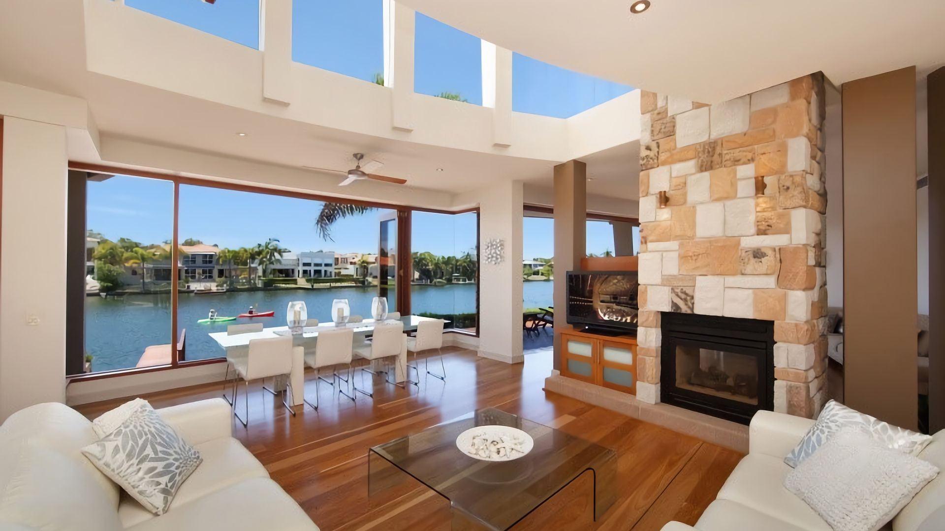 Relax in the solar heated pool and spa - please note that temperature cannot be guaranteed as it is subject to weather conditions. Also featuring outdoor cabana games room, entertaining deck and landscaped gardens, majestic gas fireplace, TV room - with one of 6 TV's, DVD, Foxtel (Includes a curved screen Samsung TV). These property also features 3 baths, a private jetty and security access.